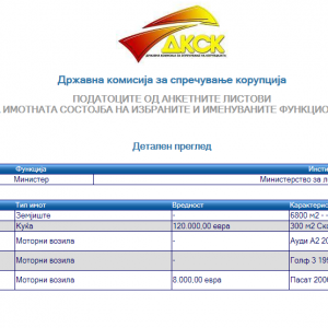 Според неговиот анкетен лист доставен до Државната комисија за спречување корупција, на свои име пријавил две возила, Голф 3 и Пасат.
