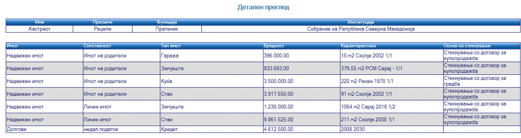 Има и кредит од 4,6 милиони денари, кој треба да го врати до 2030 година.