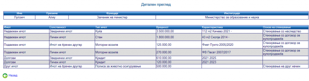 еМагазин го разгледа анкетниот лист на Алиу кој го доставил до Антикорупциска комисија кога станал заменик министер.