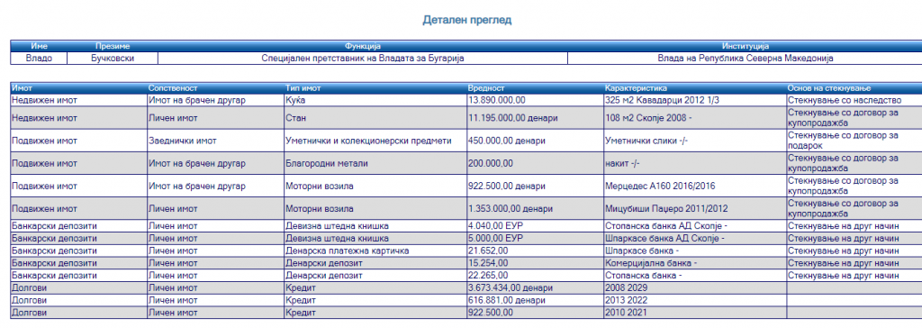 Има и заштеда од околу 9 илјади евра, а како заеднички имот пријавил и уметнички и колекционерски предмети.