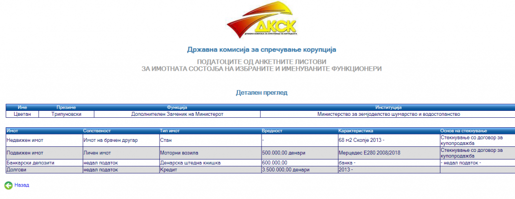 еМагазин прв го објавува анкетниот лист на заменик министерот за земјоделие, шумарство и водостопанство, Цветан Трипуновски, кој го доставил до Антикорупциска комисија.