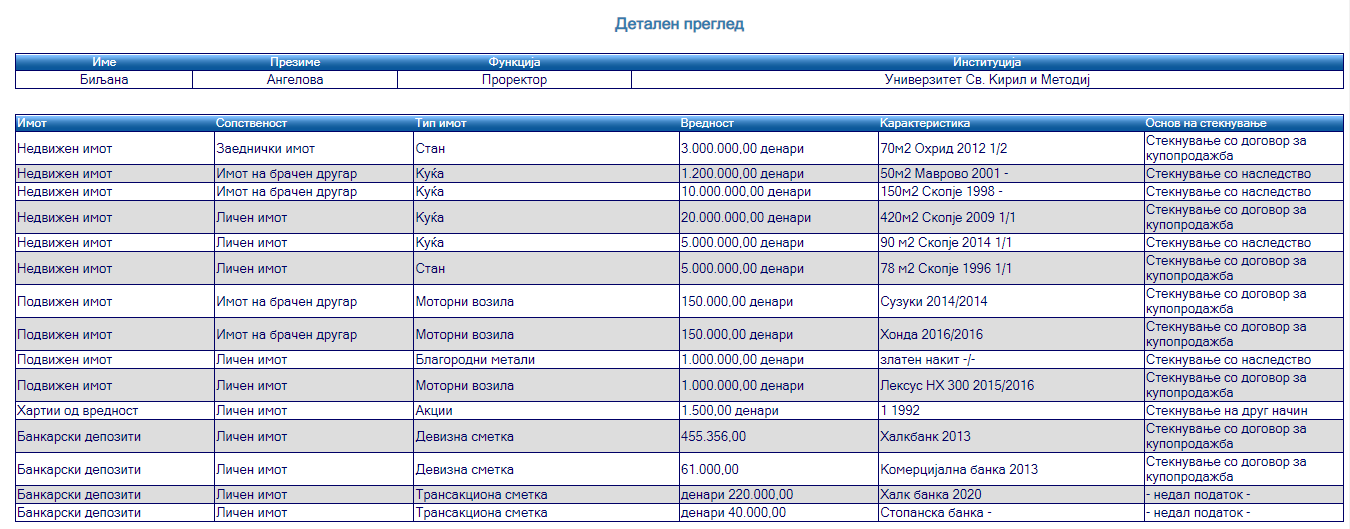 На свое име пријавила и девизни сметки, на едната тогаш имала 61.000 евра, а на другата 455,3 илјада денари.