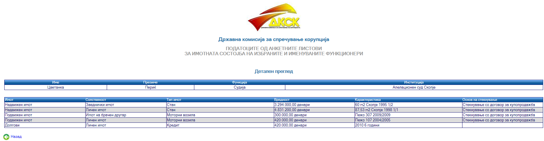 еМагазин го разгледа нејзиниот анкетен лист, кој го доставила до Државната комисија за спречување корупција, кога станала судија во Апелациониот суд, во 2011 година.