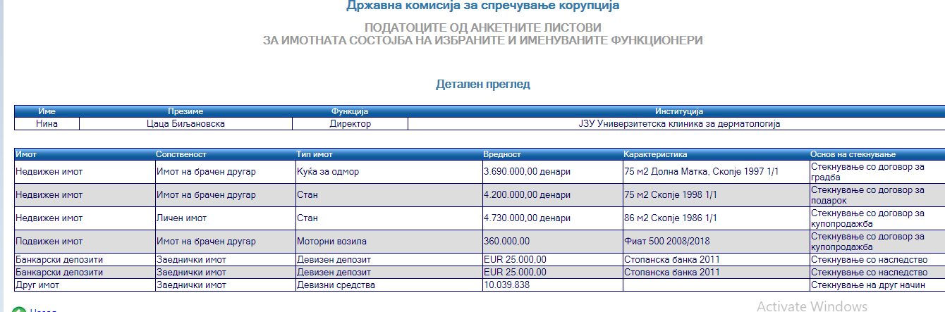 На име на сопругот пак пријавила куќа за одмор во Долна Матка, од 75 метри квадратни, проценета на 3,6 милиони денари, стекната со договор за купопродажба и стан – подарок во Скопје од 75 метри квадратни, проценет на 4,2 милиони денари.