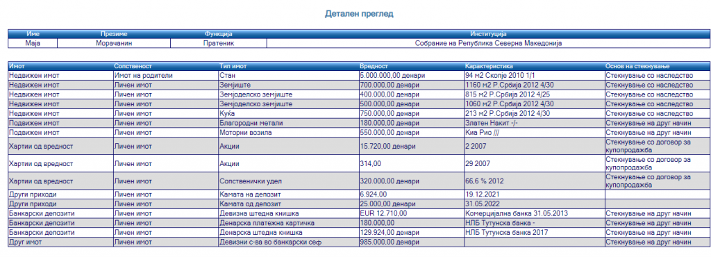 Каков имот пријавила Маја Морачанин, која повторно е избрана за претседателка на ДОМ