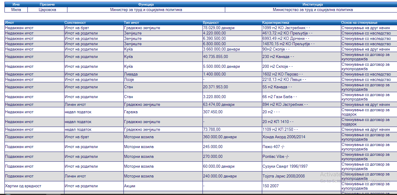 На име на родителите пријавила и стан во Скопје од 66 метри квадратни, проценет на 3,2 милиони денари и стан во Канада, од 55 метри квадратни, проценет на 20.3 милиони денари.