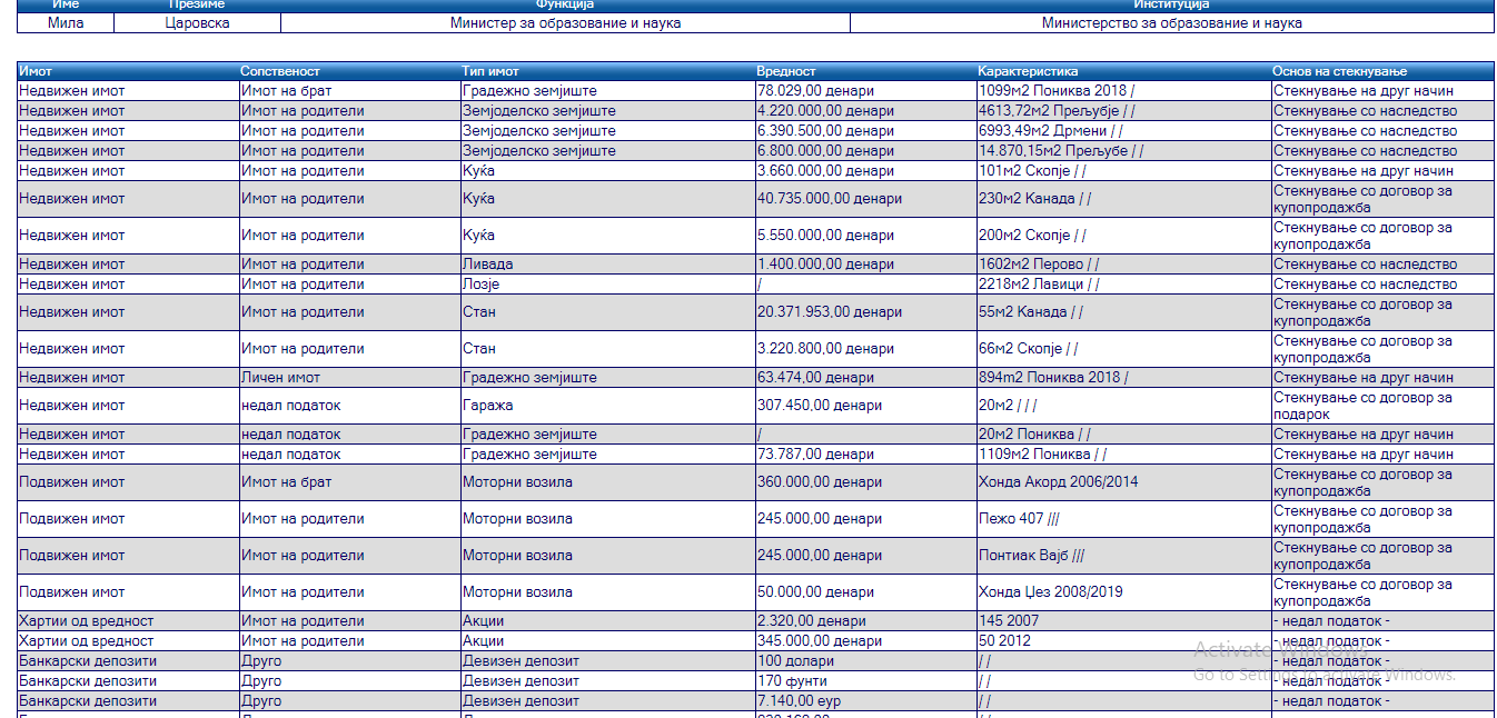 На свое име нема ни стан, ни куќа, но затоа на име на родителите пријавила две куќи во Скопје, една во Канада и два стана во Скопје.