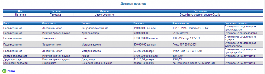На име на сопругот пријавила куќа за одмор во Струга, а како заеднички имот две возила, Пежо и Фиат.