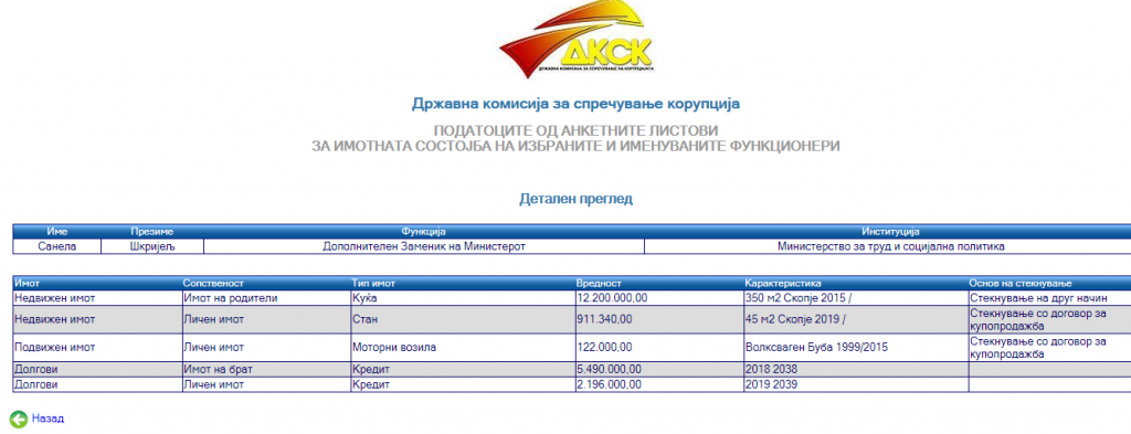 еМагазин прв го објавува анкетниот лист на Санела Шкријељ, заменик министерка во Министерството за труд и социјална политика, кој го доставила до Антикорупциска комисија.