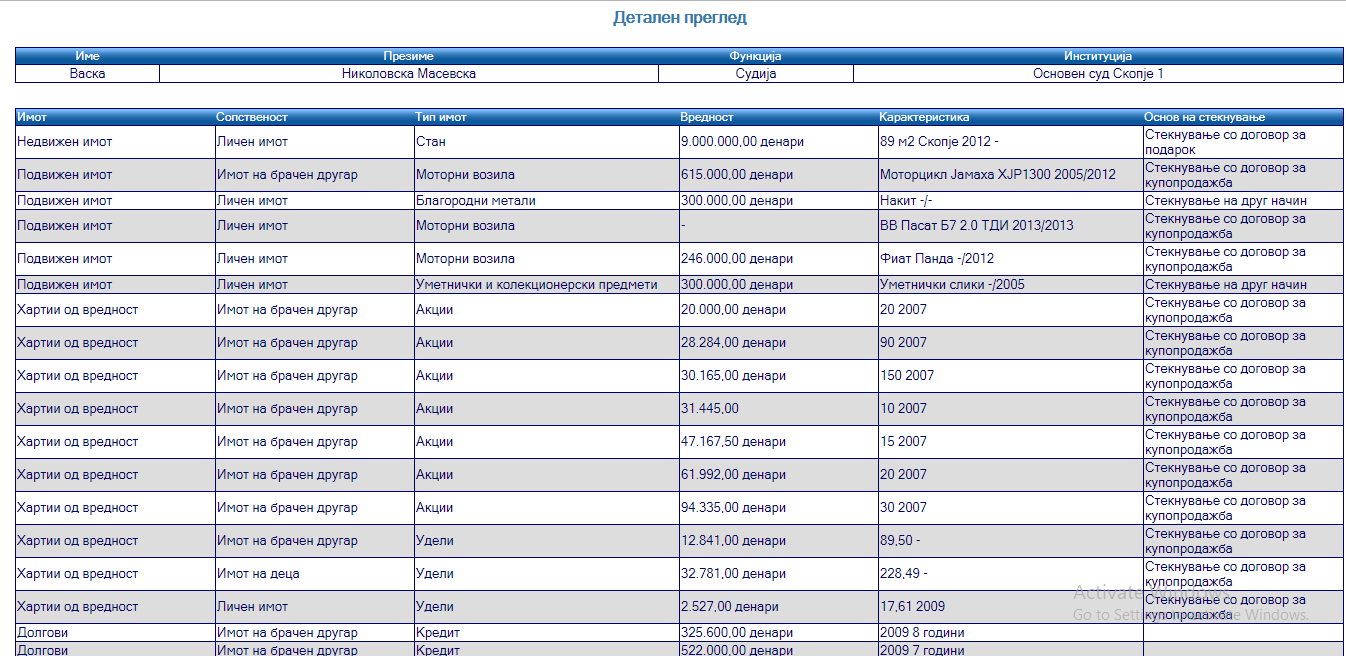 еМагазин го разгледа нејзиниот анкетен лист кој го доставила до Државната комисија за спречување корупција кога станала судија во Основен суд Скопје 1.