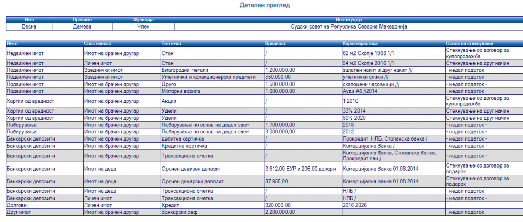 На име на сопругот пријавила скапоцени часовници, возило Ауди А6, банкарски сеф во кој чува 2,2 милиони денари, акции и удели, но не навела каде.