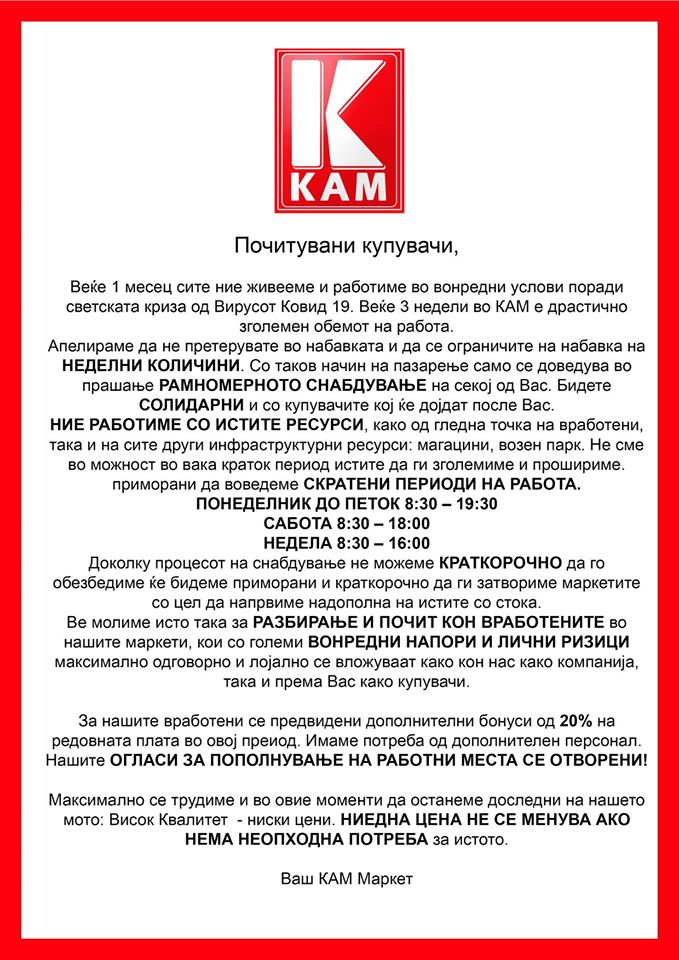 Апелираме да не претерувате во набавката и да се ограничите во набавката на неделни количини, соопшти вчера ланецот маркети „КАМ“ на својата Фејсбук страница.