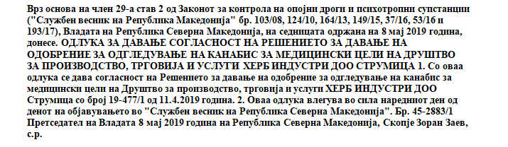 Друштвото за производство, трговија и услуги „Херб индустри“ ДОО Струмица добило дозвола да се занимава со производство на медицинска марихуана од Владата минатата година, а одлуката во Службен весник е објавена во мај 2019 година.