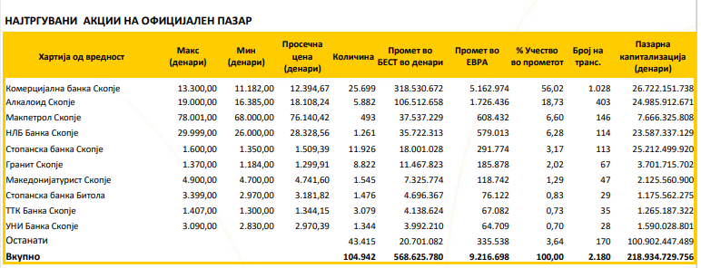 Македонската берза го објави билтенот за февруари, а оваа се најтргуваните акции: