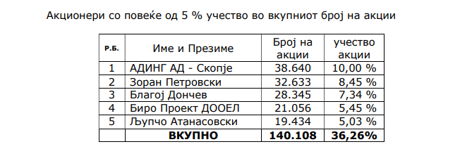 Во Годишниот извештај за минатата година, објавен преку Македонската берза, Адинг АД Скопје ги објави акционерите кои поседуваат над 5% од акциите во компанијата: