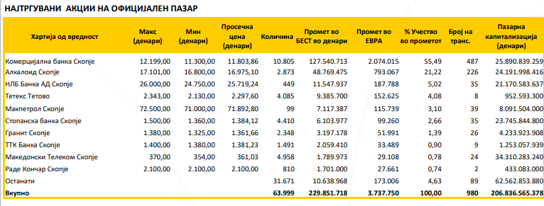 Македонската берза го објави билтенот за август, а оваа се најтргуваните акции: