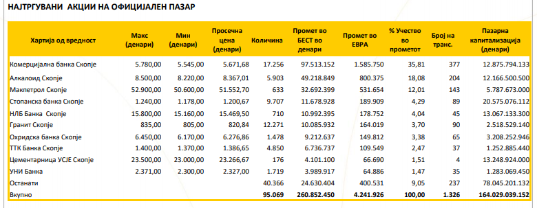 Според билтенот на Македонската берза за март, оваа се најтргуваните акции на официјалниот пазар на Берзата минатиот месец: