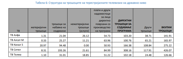 Сител потрошила најмногу средства за набавка на содржини (193,26 милиони денари) и за плати за вработените кои се директно поврзани со производство на програма (84,99 милиони денари), Канал 5 имала највисоки материјални трошоци (20,97 милиони денари), а Алфа највисоки нематеријални трошоци (26,12 милиони денари)„, стои во Анализата.