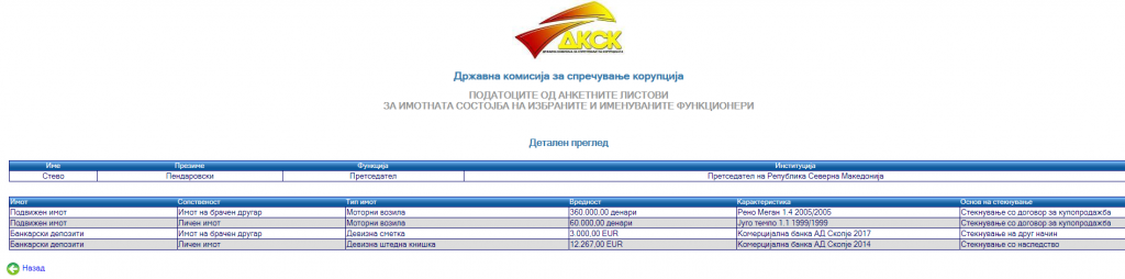 На веб страната на Државната комисија за спречување на корупцијата е објавен неговиот анкетен лист кој го поднел откако станал претседател.