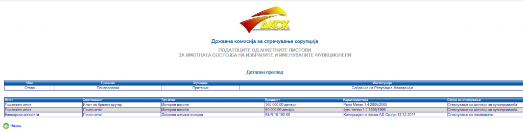 На страната на Антикорупциска комисија стои и неговиот анкетен лист од 2016 година, кога станал пратеник.