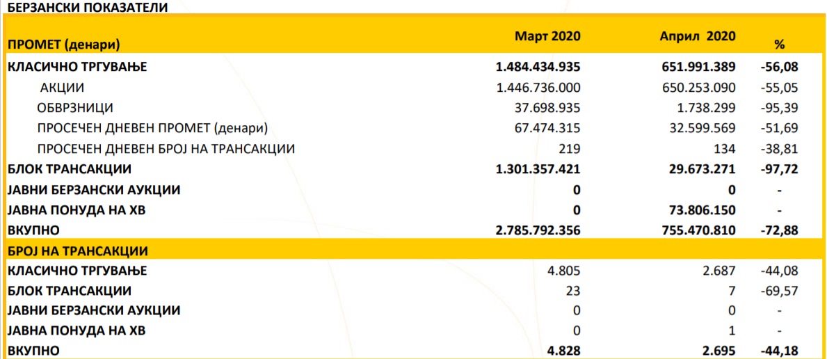Во април бил остварен вкупен промет од 755,4 милиони денари, што е намалување за 72,88 отсто во однос на март, кога бил остварен промет од 2,7 милијарди денари.