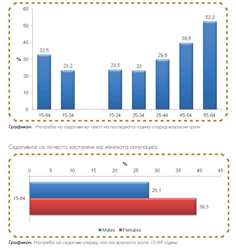 „Употребата на седативи пропорционално расте со возраста. 24% од лицата на возраст од 15-64 години и 14% од лицата на возраст од 15-34 години користеле седативи во текот на последниот месец, со најголема застапеност кај лицата на возраст од 55-64 години (47,6%). Седативите се почесто користени од 31,4% жени, во споредба со 19,5% мажи на возраст од 15-64 години, во текот на последниот месец“, пишува во извештајот.