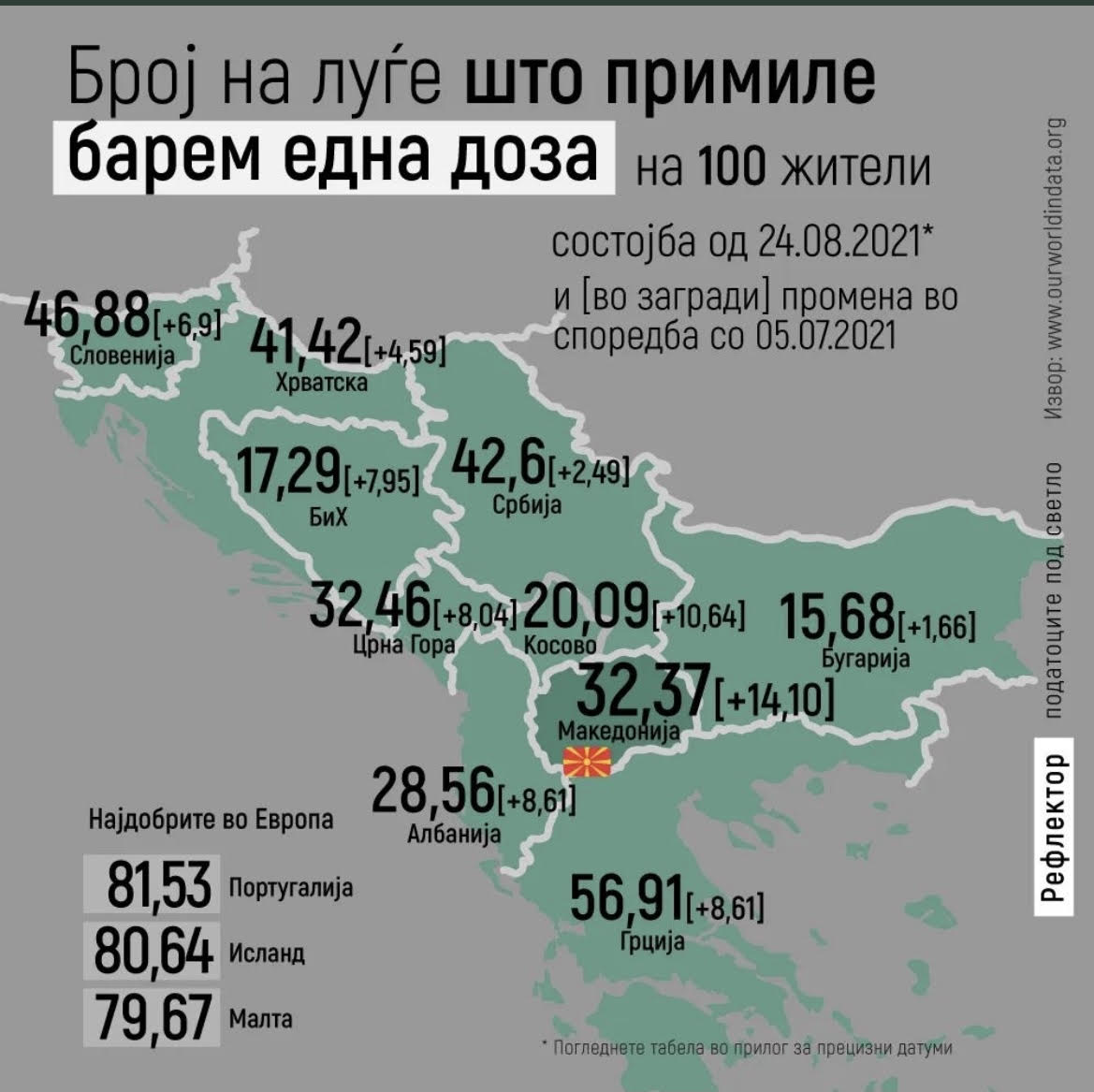 Во истиот период, веднаш по Северна Македонија се наоѓаат Косово, со 10,64 отсто, Албанија и Грција со 8,61 отсто и Црна Гора со 8,04 отсто зголемен процент на вакцинирани граѓани со барем една доза од вакцината. Зголемувањето во Босна изнесува 7,95 отсто, додека во Словенија 6,9 отсто.