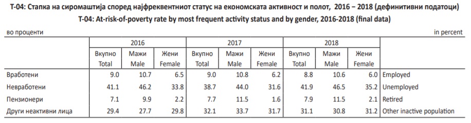 Стапкатата на сиромашни вработени лица е 8.8 %, додека стапката на сиромашни пензионери е 7.9 %.