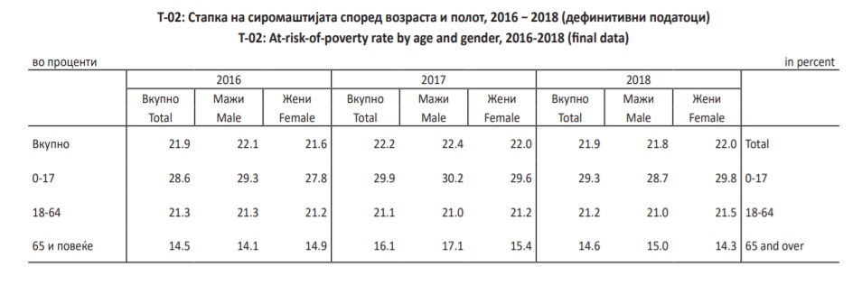 Тоа го покажуваат најновите податоците на Државниот завод за статистика, кој врз основа на Анкетата за приходите и условите за живеење, која се спроведува во согласност со препораките на Европската Унија, ги пресмета индикаторите за сиромаштија за 2018 година.