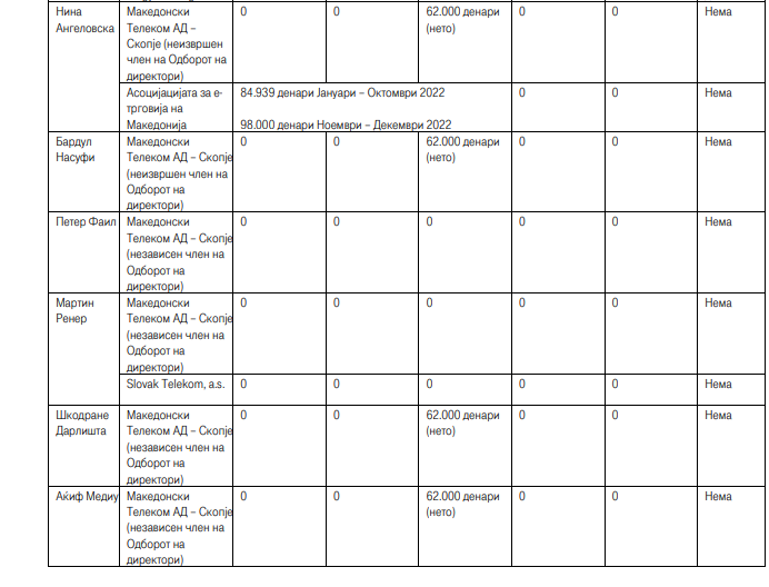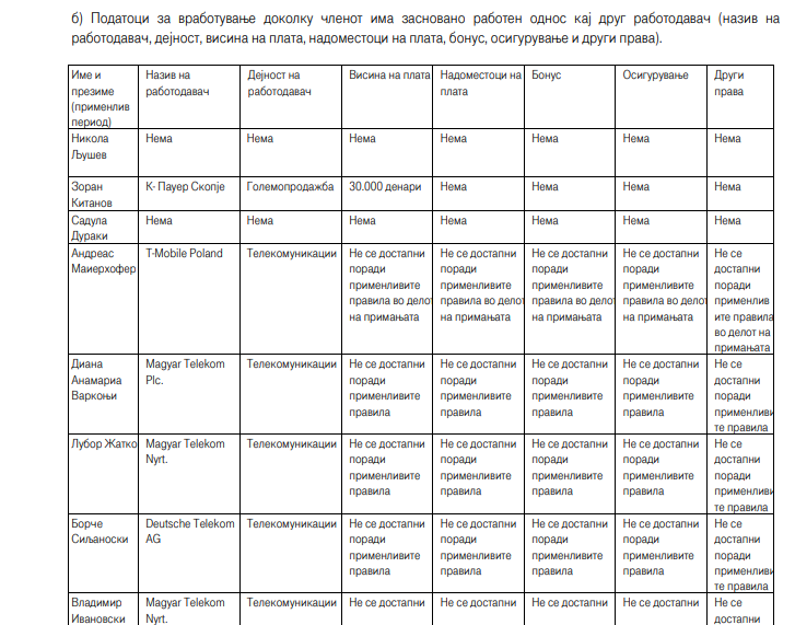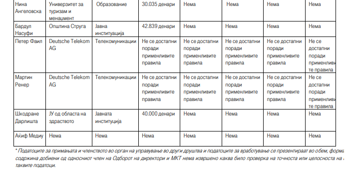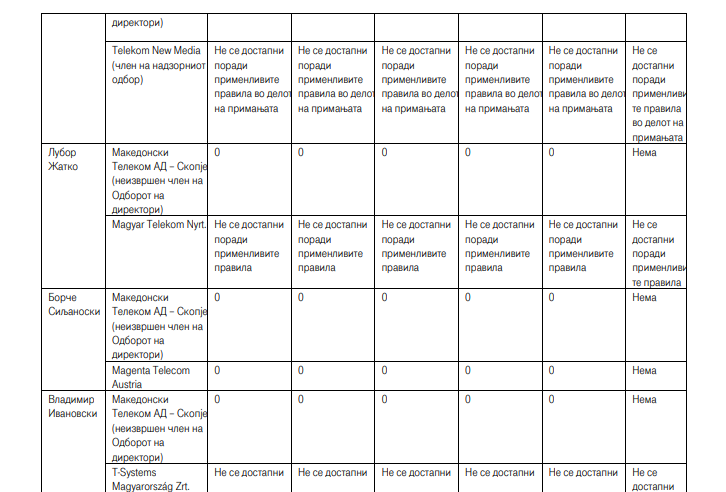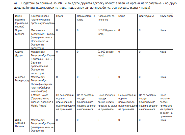 Македонски телеком АД Скопје во годишниот извештај за минатата година, објавен на Македонската берза ги објави надоместоците и платите на владините преставници во Одборот на директори: