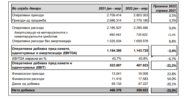 “Следствено, EBITDA маргината во првите три месеци од 2022 година изнесува 40,8% во споредба со 43,7% на крајот од истиот период од претходната година.