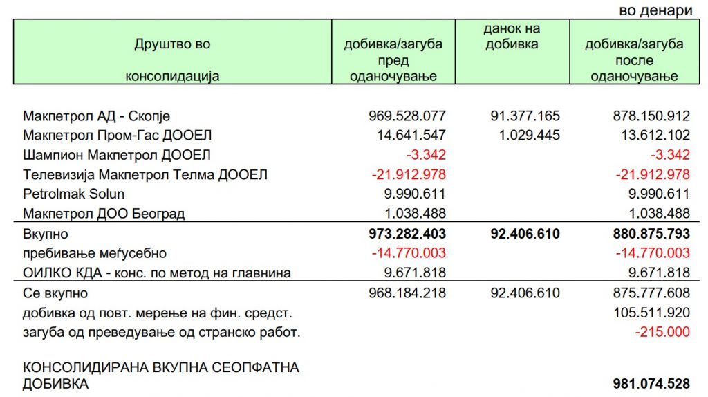 На крајот на овој период, друштвото и подружниците остварија позитивни финансиски резултати искажани преку добивка пред оданочување во износ од 968,2 милиони денари, односно добивка по оданочување во износ од 875,8 милион денари (14,2 милиони евра), која е поголема 13,3% од остварената добивка минатата година кога изнесуваше 773,2 милион денари“, соопшти компанијата.