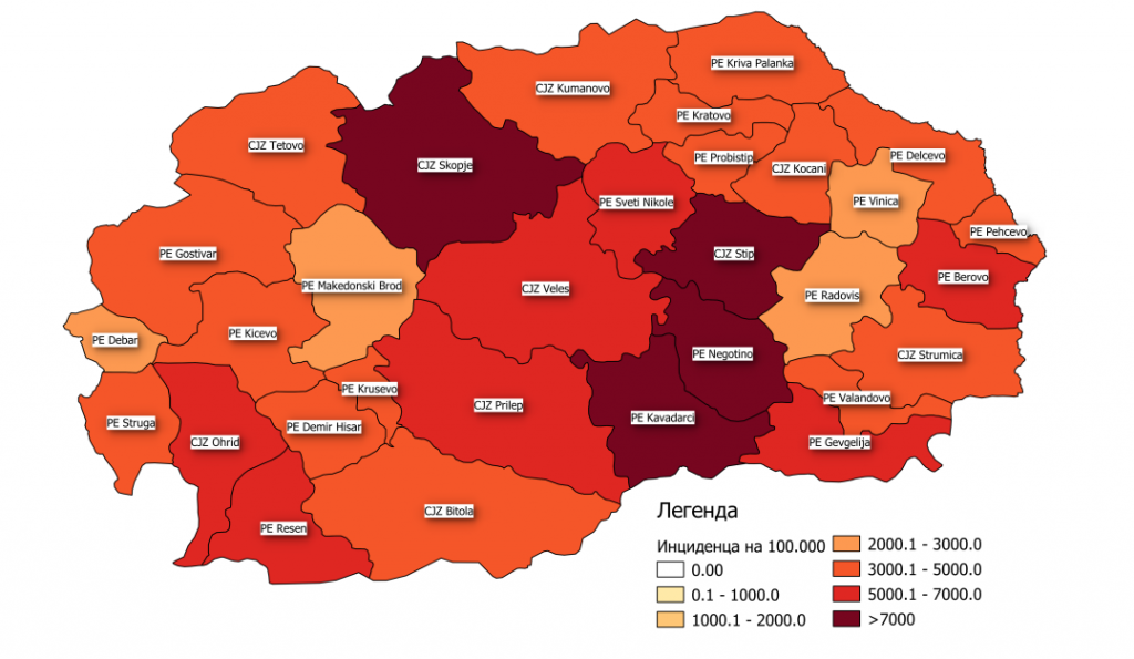 „Највисока кумулативна инциденца на 100.000 жители се регистрира во Кавадарци со 9.564,5 на 100.000 жители, Неготино (9.143,4/100.000) и Скопје (8.640,9/100.000), а најниска инциденца со 2.473,9 заболени на 100.000 жители се регистрира во Македонски Брод„, стои во извештајот на ИЈЗ, кој еМагазин редовно го пренесува.