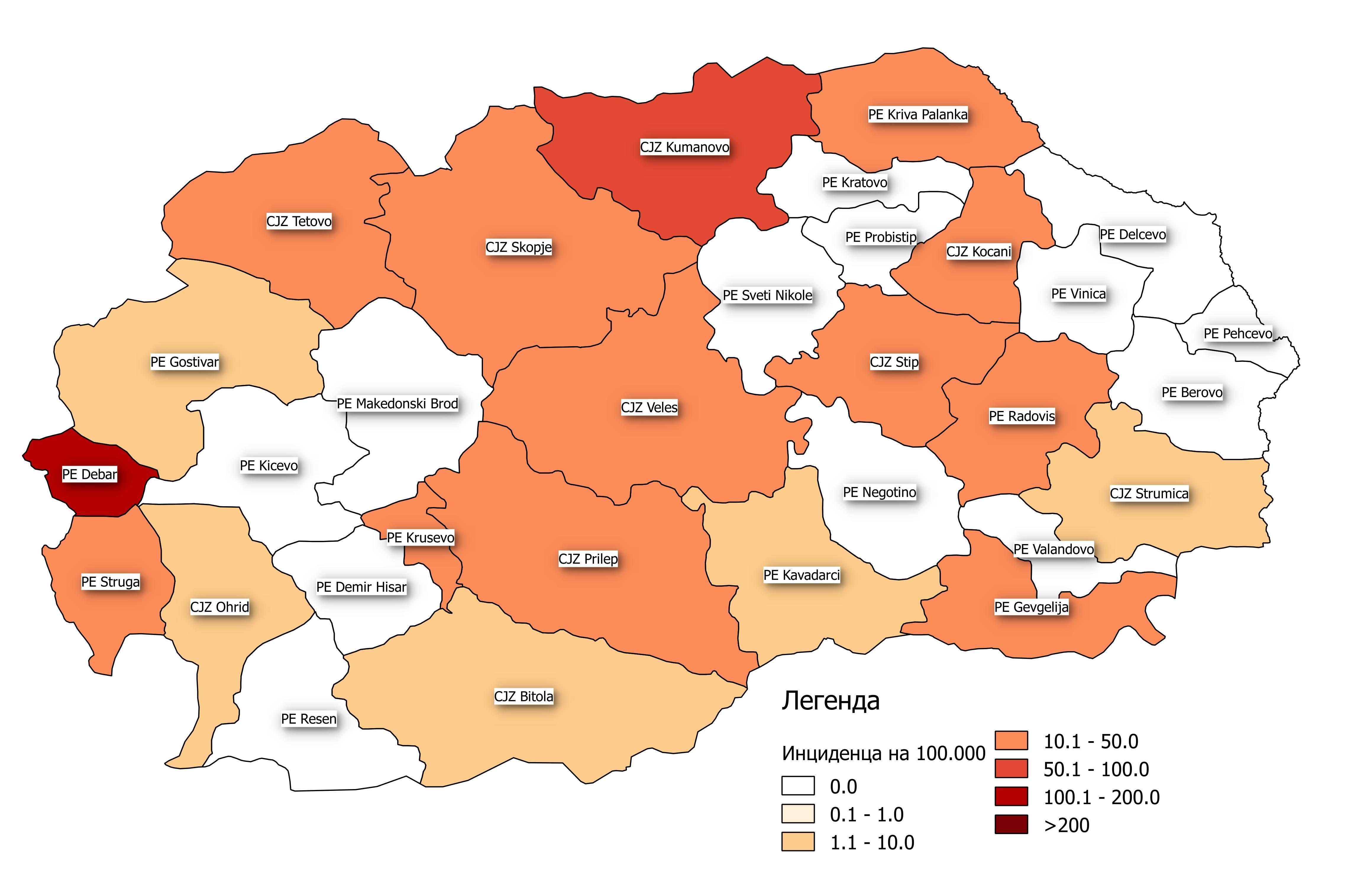 “Највисока кумулативна инциденца на 100.000 жители се регистрира во Дебар со 176,5 заболени на 100.000 жители, во Куманово инциденцата на 100.000 жители е 91,1, додека инциденца над 30 на 100.000 жители е регистрирана во Скопје, Кочани, Штип, Прилеп, Крушево и Струга“, стои во анализата.
