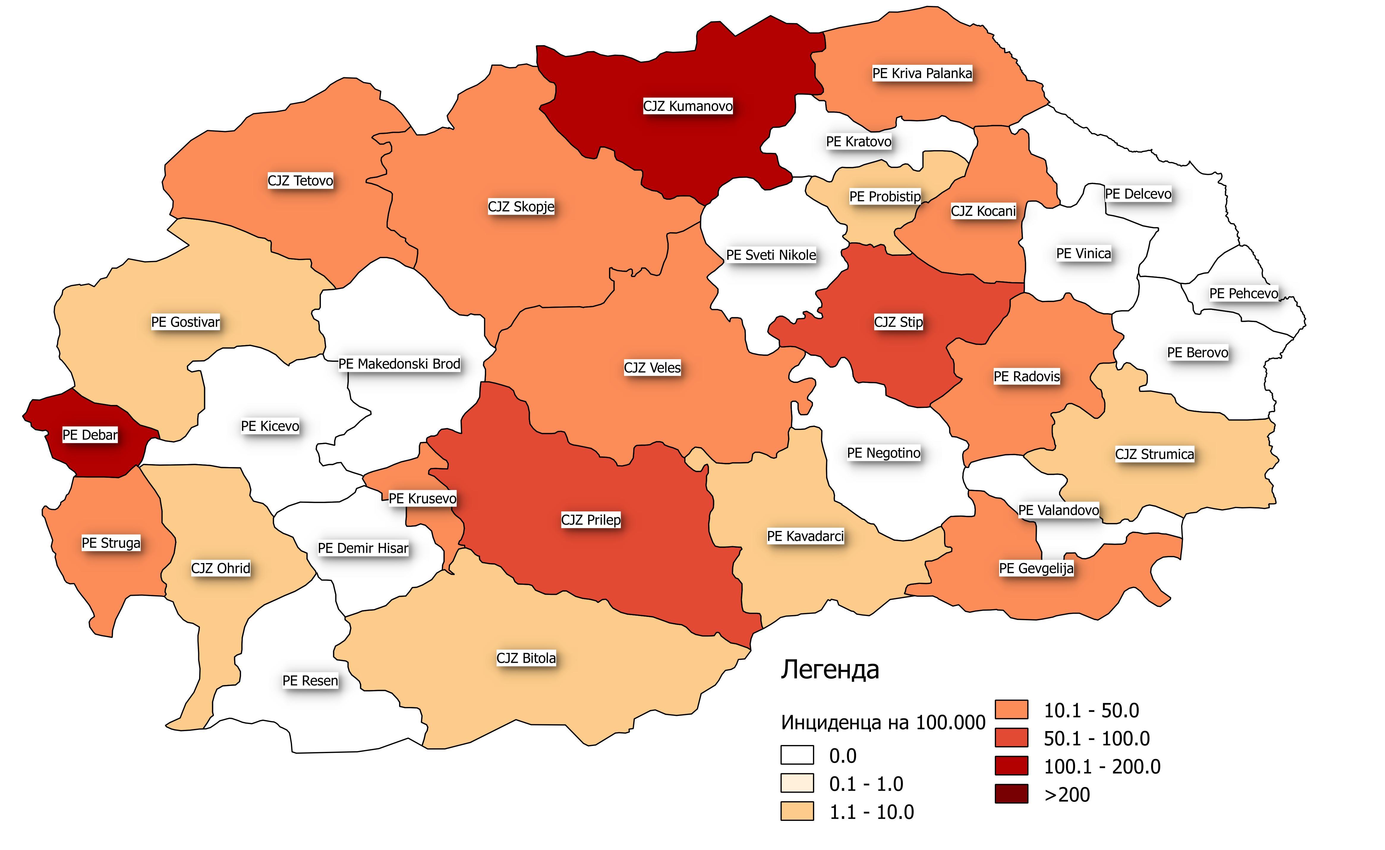 “Највисока кумулативна инциденца на 100.000 жители се регистрира во Дебар со 176,5 заболени на 100.000 жители, во Куманово инциденцата на 100.000 жители е 127,6, додека инциденца над 40 на 100.000 жители е регистрирана во Скопје, Штип, Прилеп, Кочани и Струга“, стои во анализата на ИЈЗ.
