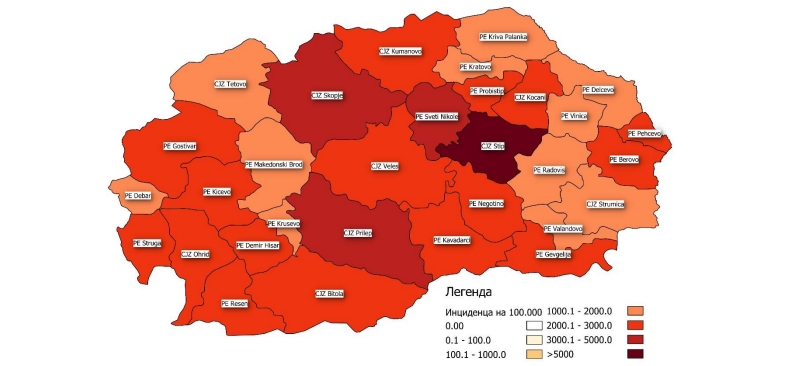 “Највисока кумулативна инциденца на 100.000 жители се регистрира во Штип со 5.076,6 на 100.000 жители, Скопје (4.367,6/100.000), Свети Николе (4.104,9/100.000) и Прилеп (3.157,9/100.000), инциденца под 1.500 заболени на 100.000 жители е регистрирана само во Крушево и Радовиш“, стои во извештајот на ИЈЗ, кој еМагазин редовно го пренесува.