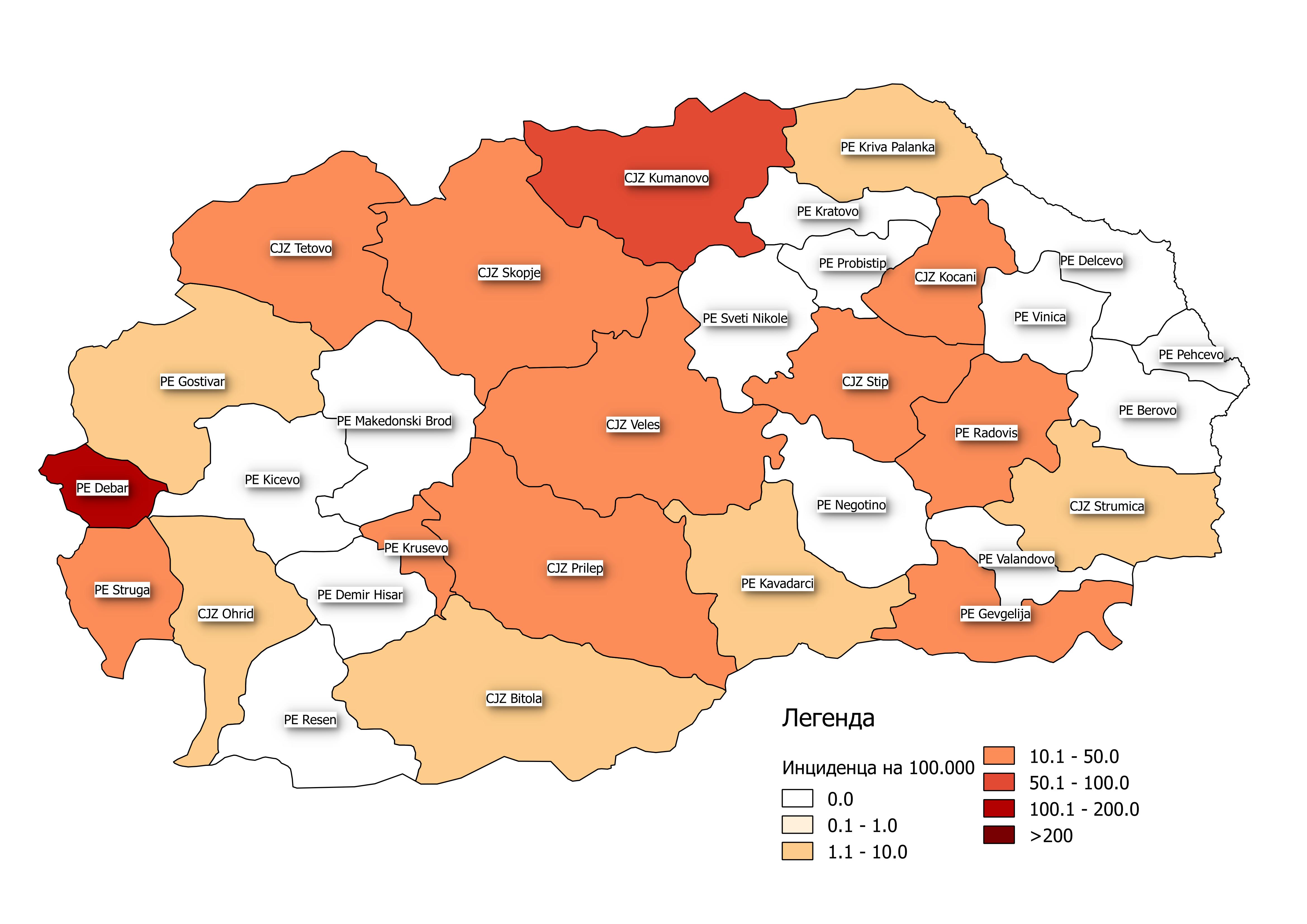 Највисока кумулативна инциденца на 100.000 жители се регистрира во Дебар со 176,5 заболени на 100.000 жители, а во Куманово инциденцата на 100.000 жители е 65,2 додека во Скопје инциденцата е 35,8 на 100.000 жители“, стои во анализата на податоците од страна на Институтот за јавно здравје (ИЈЗ).