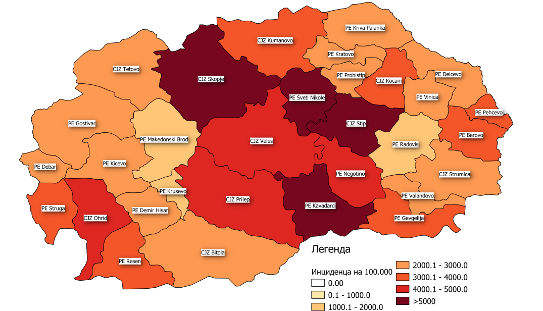 „Највисока кумулативна инциденца на 100.000 жители се регистрира во Штип со 6.295,4 на 100.000 жители, Скопје (5.889,3/100.000), Свети Николе (5.084,8/100.000) и Кавадарци (5.026,3/100.000), а инциденца под 2.000 заболени на 100.000 жители се регистрира во Македонски Брод, Радовиш и Крушево„, стои во извештајот на ИЈЗ, кој еМагазин редовно го пренесува.
