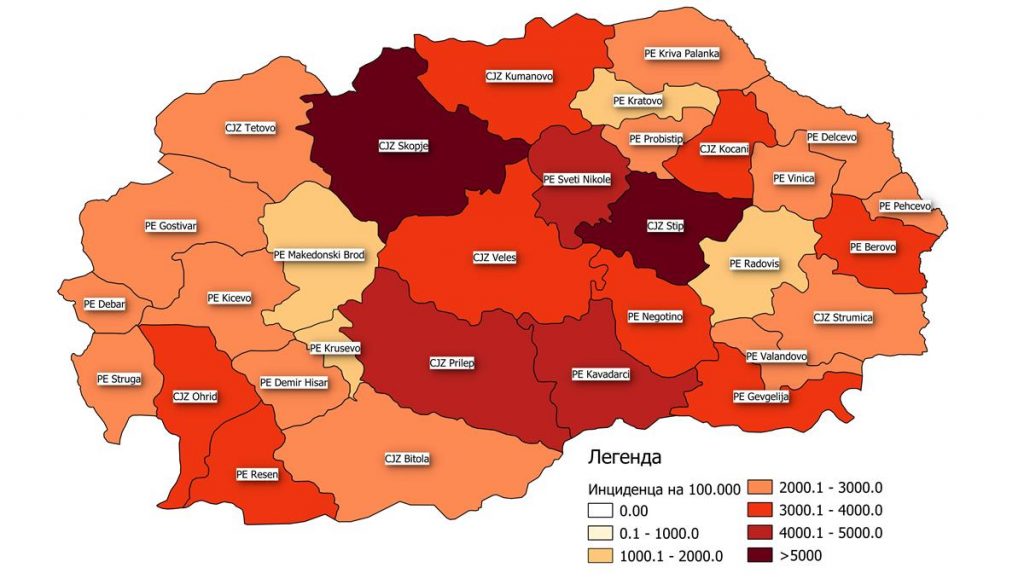 “Највисока кумулативна инциденца на 100.000 жители се регистрира во Штип со 6.061,9 на 100.000 жители, Скопје (5.478,4/100.000), Свети Николе (4.923,9/100.000), Кавадарци (4.396,5/100.000), Прилеп (4.139,8/100.000) и Неготино (4.009,3/100.000), инциденца под 2.000 заболени на 100.000 жители се регистрира во Кратово, Македонски Брод, Радовиш и Крушево“, стои во извештајот на ИЈЗ, кој еМагазин редовно го пренесува.