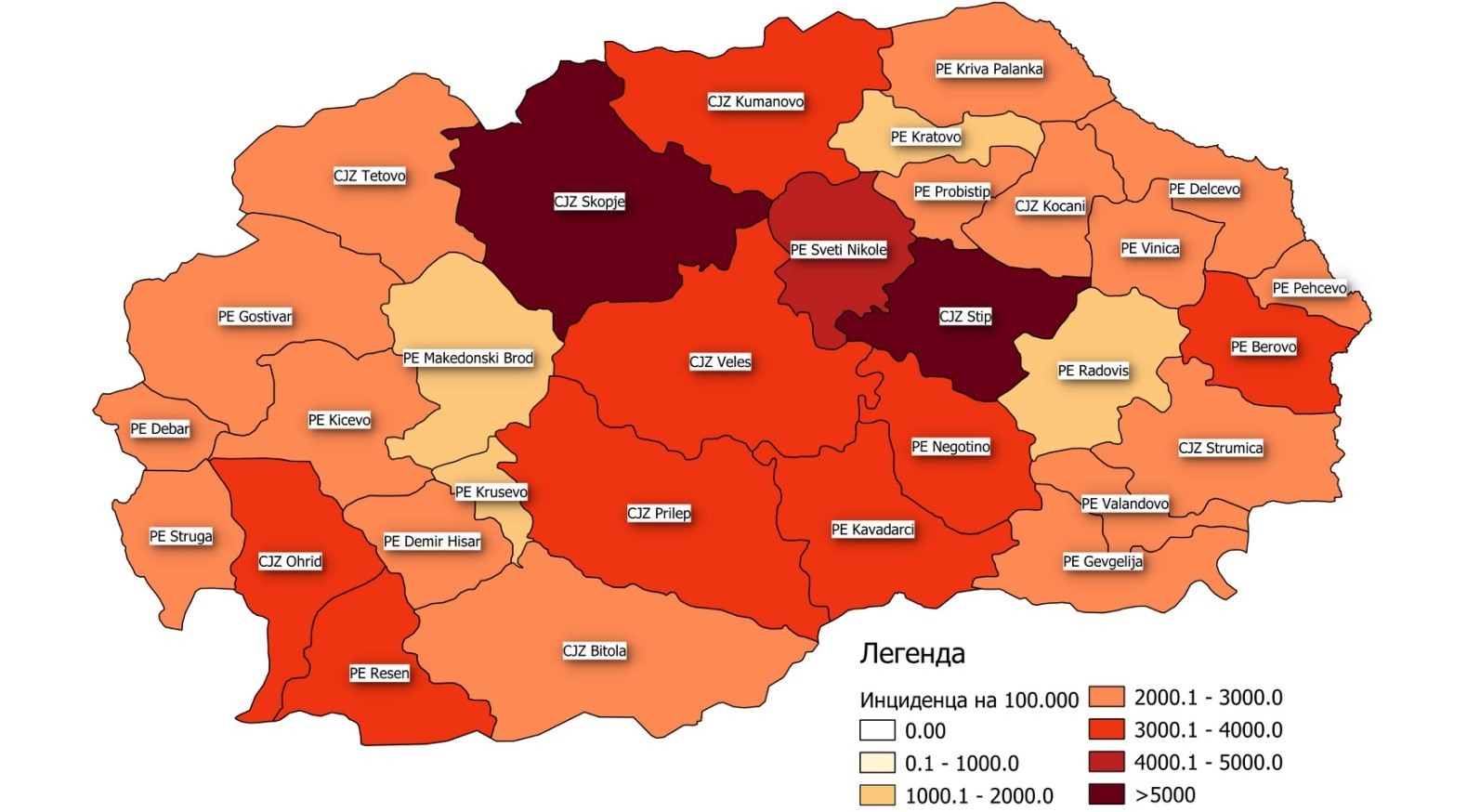 „Највисока кумулативна инциденца на 100.000 жители се регистрира во Штип со 5.832,2 на 100.000 жители, Скопје (5.160,1/100.000), Свети Николе (4.777,7/100.000), Кавадарци (3.989,9/100.000), Прилеп (3.855,5/100.000) и Велес (3.699,2/100.000), инциденца под 2.000 заболени на 100.000 жители се регистрира во Дојран, Богданци, Македонски Брод, Радовиш и Крушево“, стои во извештајот на ИЈЗ, кој еМагазин редовно го пренесува.
