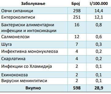 Првите две најчести заболувања се овчи сипаници и ентероколити, кои учествуваат со 90,4 проценти во вкупниот број на заболени, а со 91,9 отсто во десетте најчесто пријавени акутни заразни заболувања во јули, покажуваат податоците од Билтенот на Одделот за епидемиологија на заразни заболувања при Институтот за јавно здравје (ИЈЗ).