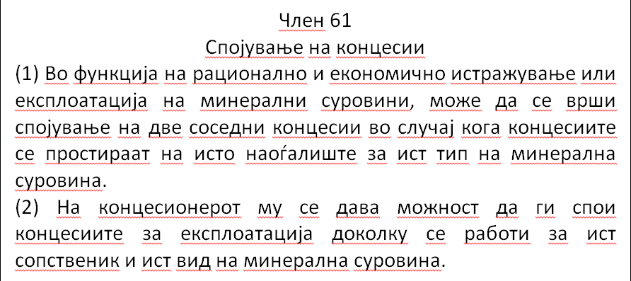 Според истиот Закон, одлука за спојување на концесиите донесува Владата по добивање на образложен предлог од Министерството за економија кое е должно да направи увид на локалитетот и да изготви Записник.