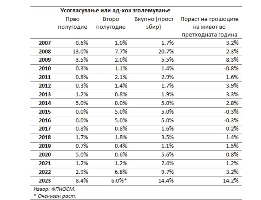 Според следната табела, усогласувањата на пензиите со трошоците на живот, како и ад-хок зголемувањата на пензиите во претходните две децении, овозможија порастот на пензиите да го следи или да го надмине порастот на трошоците на живот, и оттука, во целост да го заштити животниот стандард на пензионерите,“ велат од „Фајненс тинк“.