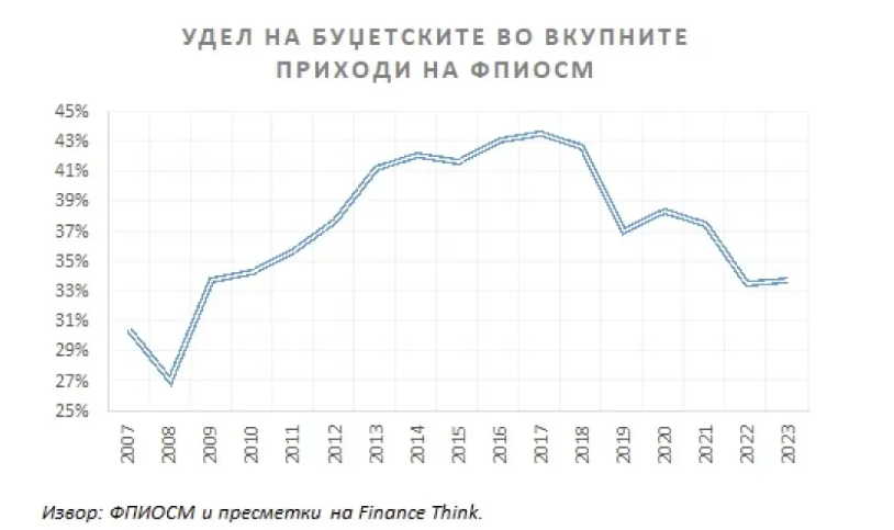 Со реформата на пензискиот систем од 2019 година, која, како што велат, меѓу другото подразбираше и благо зголемување на стапката на пензиските придонеси во две последователни години, неодржливата патека на ФПИОСМ запре и уделот на буџетските во вкупните приходи почна да се намалува и моментално се движи околу една третина.