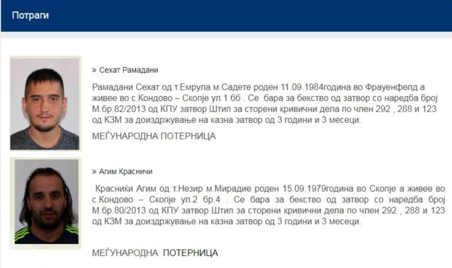 МВР распиша меѓународни потерници за Агим Красниќи и Сехат Рамадани кои се бараат за доиздржување на затворски казни.