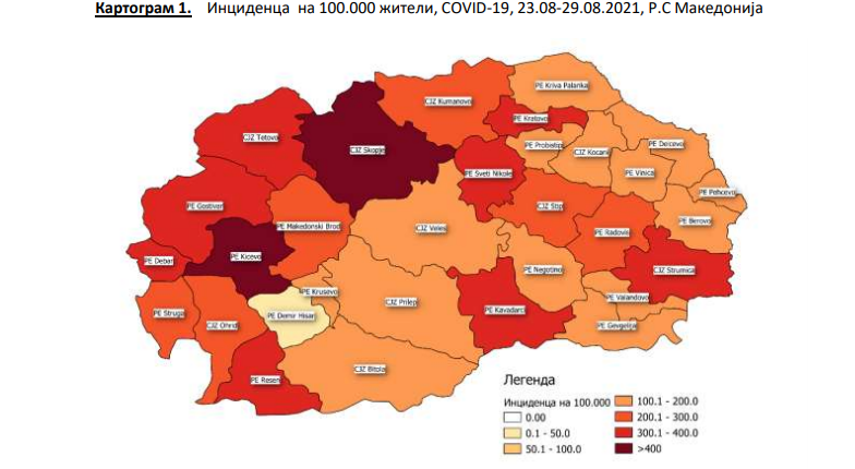 Според податоци на Институтот за јавно здравје, заклучно со 29 август највисока инциденца е регистрирана во Кичево – 456,7/100.000.