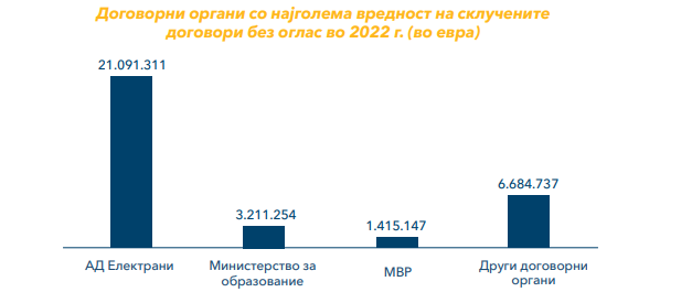 Гледано на ниво на институции, најголема вредност на склучени договори без објавување оглас од листата на државни институции во 2022 година, како и во претходната година, ја има АД Електрани, со 23 договори во вредност од 21 милион евра, стои во Извештајот од редовниот мониторинг на јавните набавки спроведени од јануари до декември 2022 година од страна на Центарот за граѓански комуникации (ЦГК).