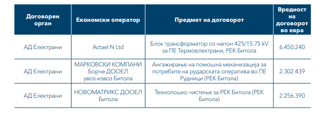 Од 10-те најголеми договори, дури осум се на АД Електрани, со тоа што најголемиот, во вредност од 6,4 милиони евра, е склучен со фирмата Actael N Ltd од Софија, Бугарија, за набавка на блок трансформатор за ПЕ Термоелектрани, РЕК Битола, велат од ЦГК.