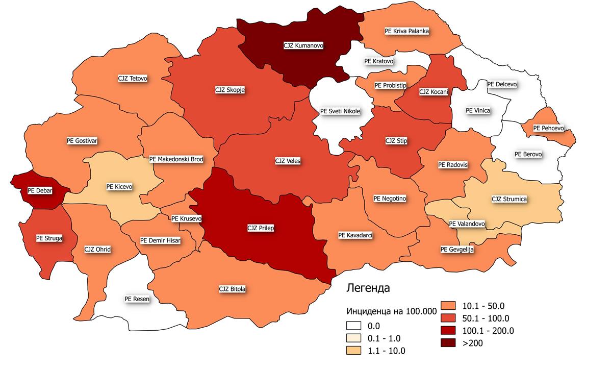“Највисока кумулативна инциденца на 100.000 жители се регистрира во Куманово со 247,4 заболени на 100.000 жители, Дебар (183,8/100.000) и Прилеп (137,4/100.000), додека инциденца над 50 заболени на 100.000 жители е регистрирана во Велес, Струга, Скопје, Штип и Кочани“, стои во анализата на ИЈЗ, заклучно до 22. април.
