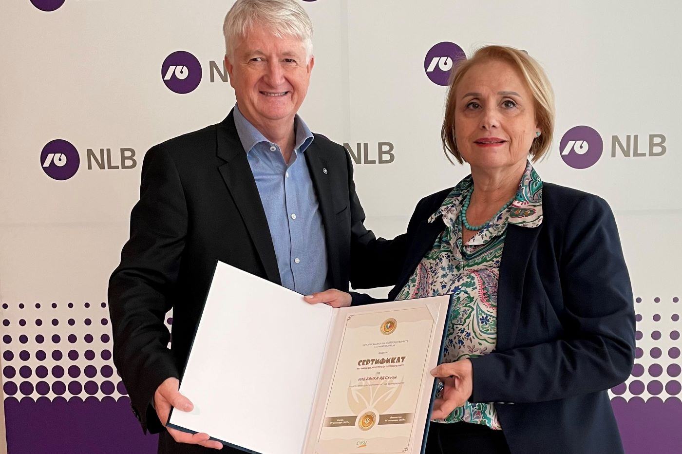 Во просториите на Банката, претседателката на Организацијата на потрошувачи на Македонија, д-р Маријана Лончар Велкова и официјално му го врачи сертификатот на претседателот на НЛБ Банка, Бранко Грегановиќ, кој во оваа прилика изјави: